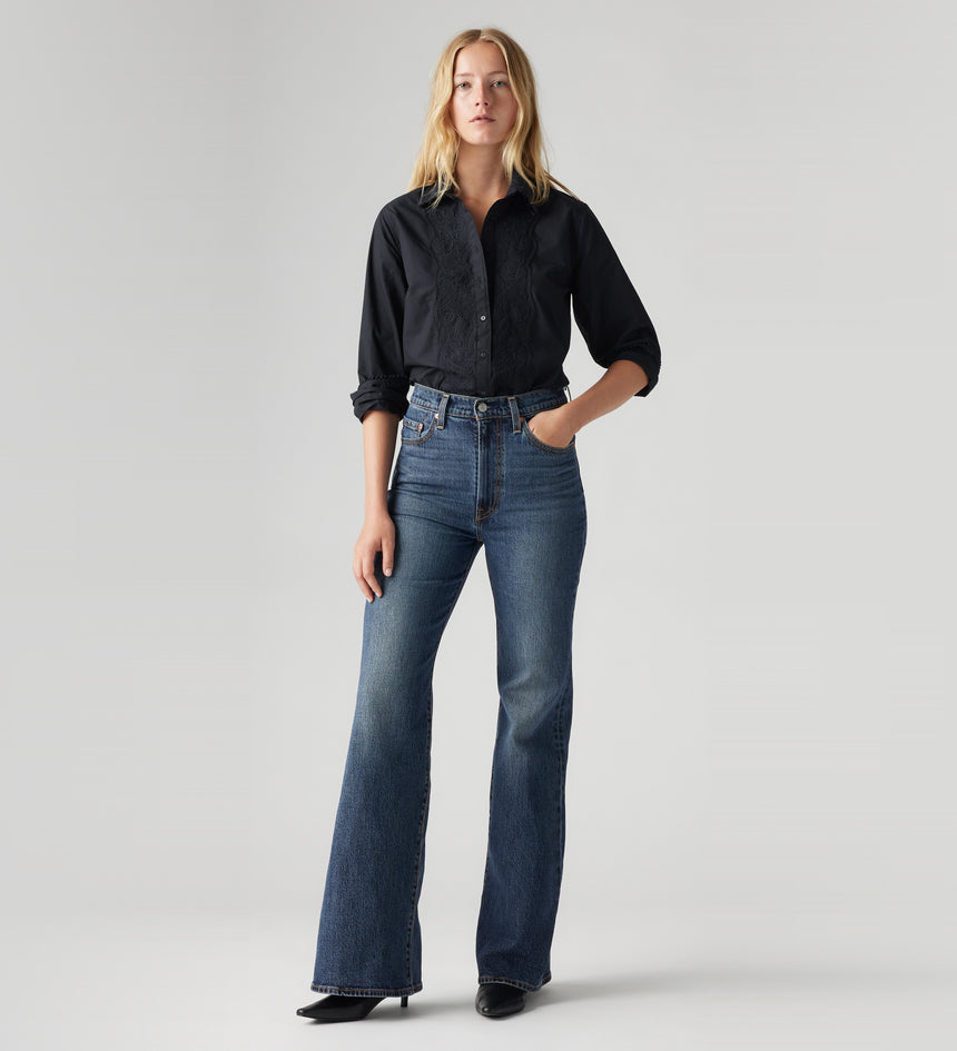 - Vintage-inspired flare-leg silhouette